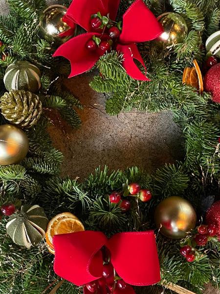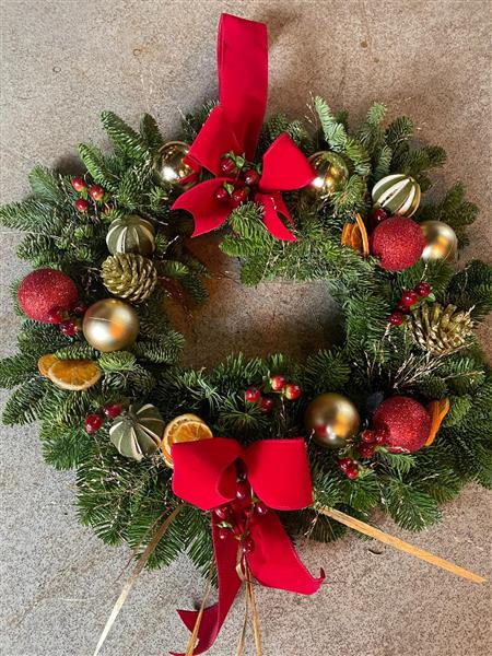 Adorn your home with our luxurious Christmas wreath, featuring lush green foliage, vibrant red berries, and delicate pine cones. Shiny gold and deep red baubles catch the light beautifully, while a prominent red bow adds a classic touch. Perfect for your front door or as a stunning centrepiece, this wreath brings timeless beauty and festive spirit to any space. Celebrate the season in style!