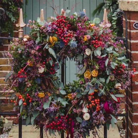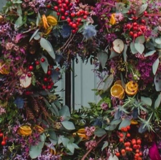 Adorn your home with our enchanting Christmas wreath, featuring lush green foliage as its base. This luxurious wreath is adorned with vibrant red berries, rich purple flowers, and delicate slices of dried oranges that add a rustic charm. Eucalyptus leaves interspersed throughout provide subtle silvery-green accents. Perfect for gracing your front door or becoming the centrepiece of your holiday display, this wreath brings the essence of the holiday spirit to any space. Celebrate the season in style!