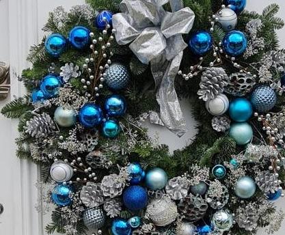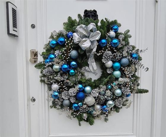 Adorn your home with our stunning Christmas wreath, featuring glossy azure baubles, matte sapphire globes, sparkling silver pinecones, and delicate snowflakes. Each ornament is meticulously placed amidst lush green foliage dusted with a touch of winter’s frost. A luxurious silver bow adds an elegant finishing touch, inviting warmth and cheer to all who behold it. Perfect for making a sophisticated statement this Christmas!