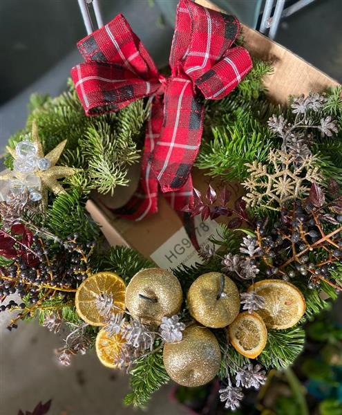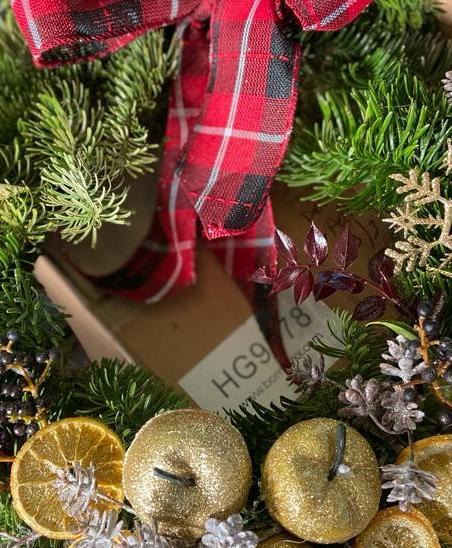 Adorn your home with our stunning Adorn your home with our stunning Christmas wreath, featuring a classic red and black plaid bow at its heart. Encircling the bow are lush evergreen branches, sparkling gold baubles, delicate crystal snowflakes, and rich burgundy berries. Adding a touch of rustic beauty, slices of dried orange bring a pop of colour and a nostalgic aroma. Perfect for gracing your front door or becoming the centrepiece of your holiday display, Celebrate the season in style!, featuring a classic red and black plaid bow at its heart. Encircling the bow are lush evergreen branches, sparkling gold baubles, delicate crystal snowflakes, and rich burgundy berries. Adding a touch of rustic beauty, slices of dried orange bring a pop of colour and a nostalgic aroma. Perfect for gracing your front door or becoming the centrepiece of your holiday display, Celebrate the season in style!